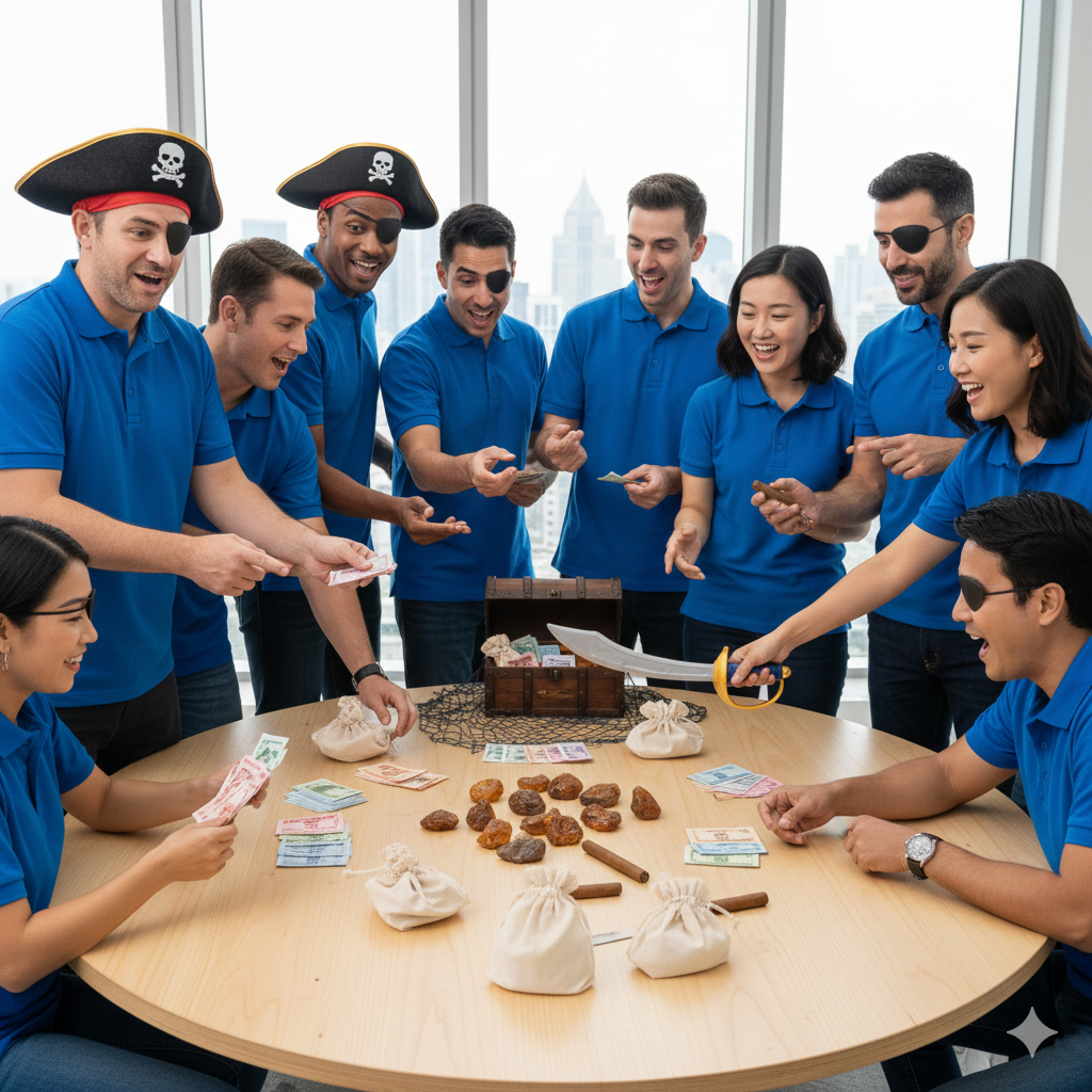 An immersive team-building programme where participants role-play pirate crews, trading goods, gathering market info, and building relationships in a pirate port to accumulate the most treasure, focusing on negotiation, communication, trust-building, and strategic networking in a fun, themed setting.